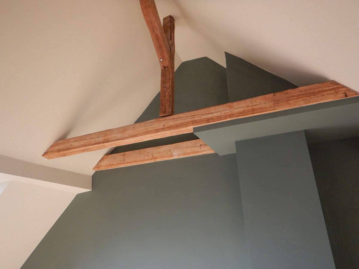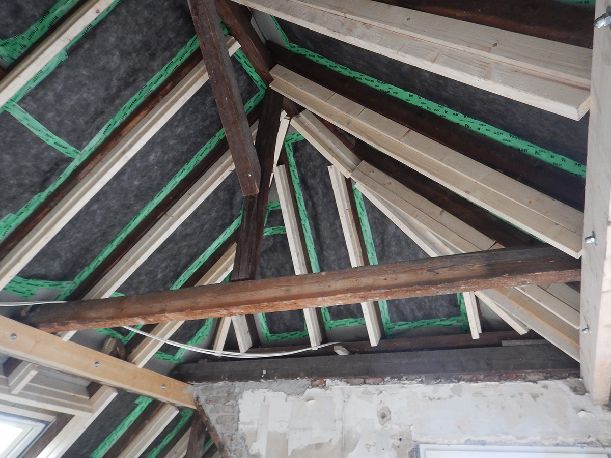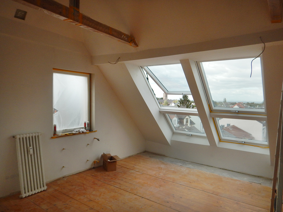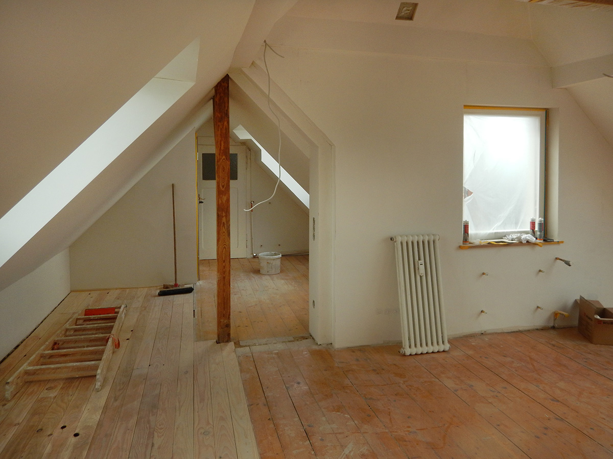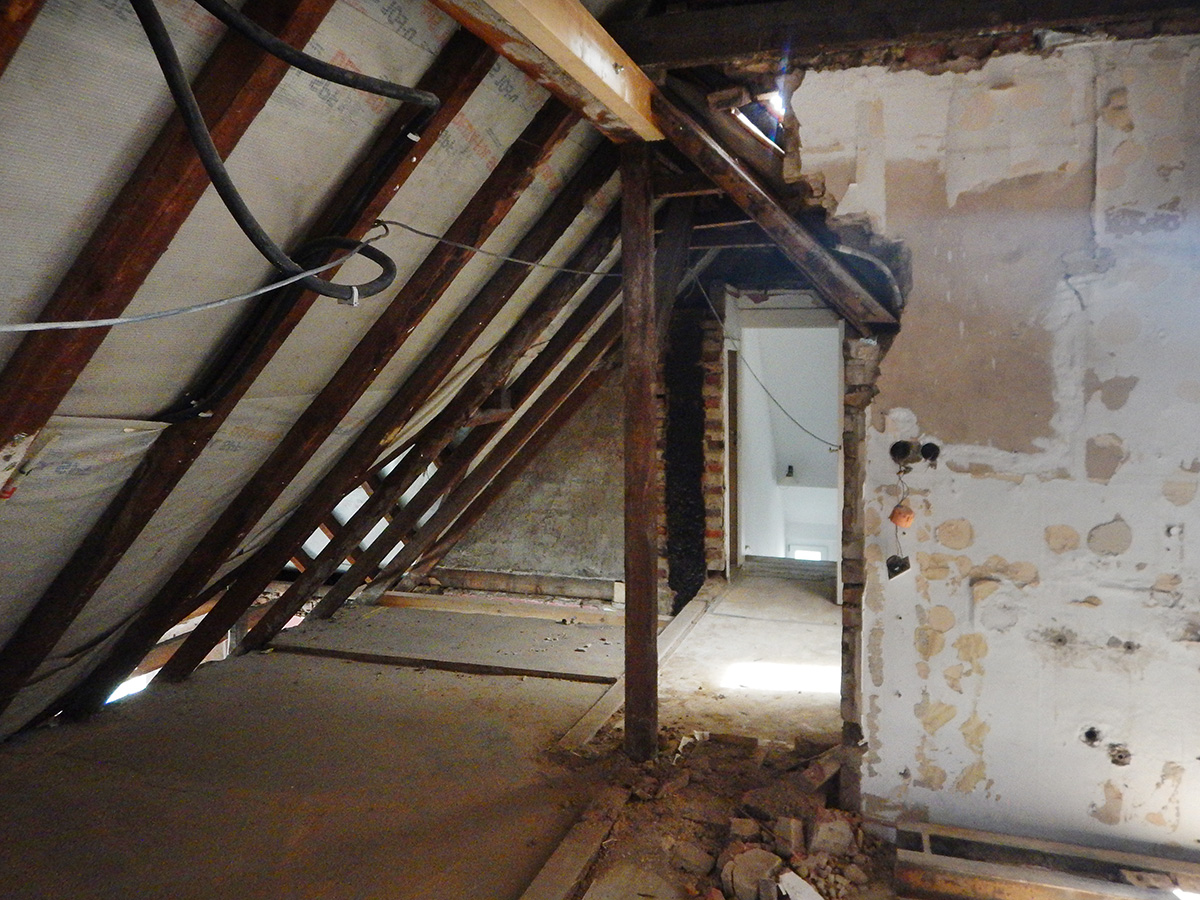 Die bereits als Maisonette-Wohnung bestehende Dachgeschosswohnung wurde in einer Komplett-Renovierung umgestaltet und mit einem zweiten Fluchtweg versehen. Einige Zwischendecken und Trempelwände wurden entfernt und die Belichtung veränderte sich durch den Einsatz von großzügigen Dachflächenfenstern. Im Zuge der Renovierung wurden Dachflächen und Außenwände mit einer innenliegenden Dämmung versehen. Diese Maßnahmen, wie auch die neuen Fenster, mussten sich bauphysikalisch auf das denkmalgeschützte Gebäude von 1894 einstellen. Sie wurden im Rahmen eines KfW-Effizienzhauses 160 gefördert. Die Baumaßnahme wurde in der zweiten Jahreshälfte 2020 durchgeführt.