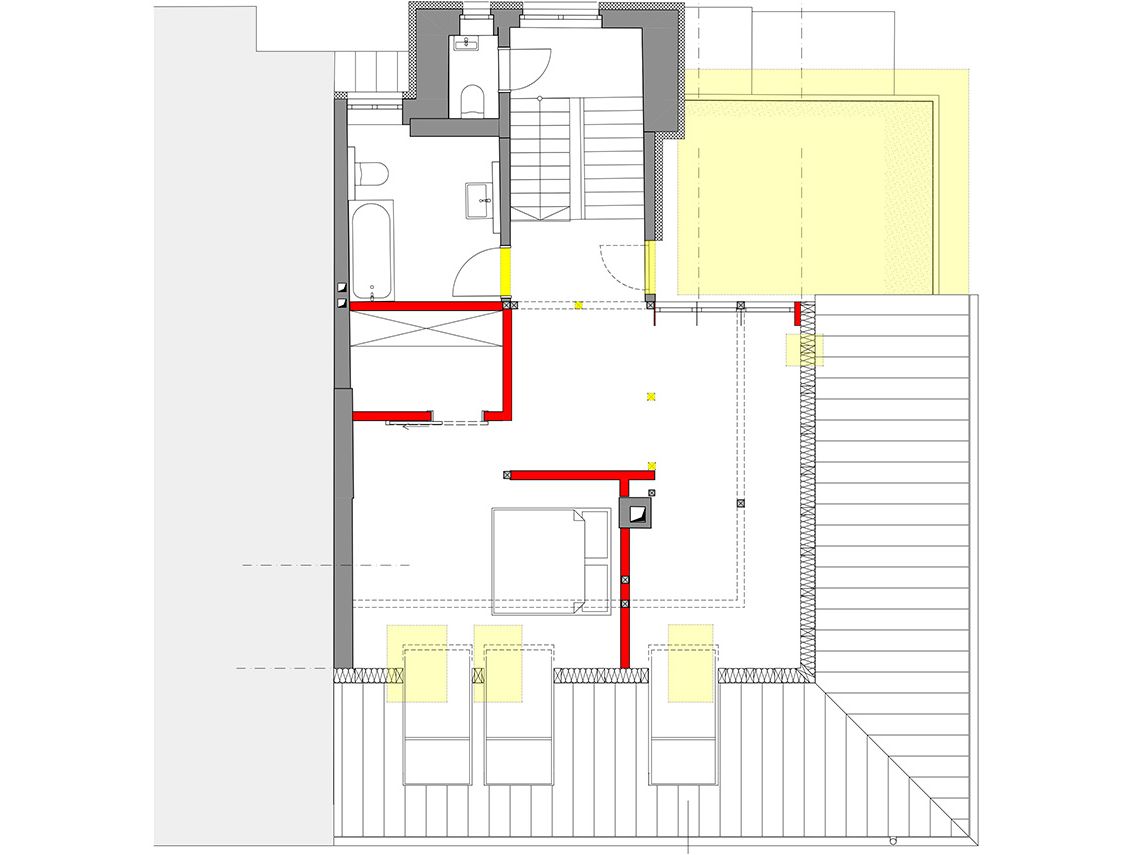 Das Gebäude aus der Mitte des 19.Jahrhunderts hatte einen Brandschaden im Dachgeschoss. Bei dem Wiederaufbau wird das Haus energetisch saniert (KfW-100) und moderat umgebaut. Im Dachgeschoss entsteht eine Terrasse. Ein außen liegender Aufzug ergänzt die Umbaumaßnahmen.