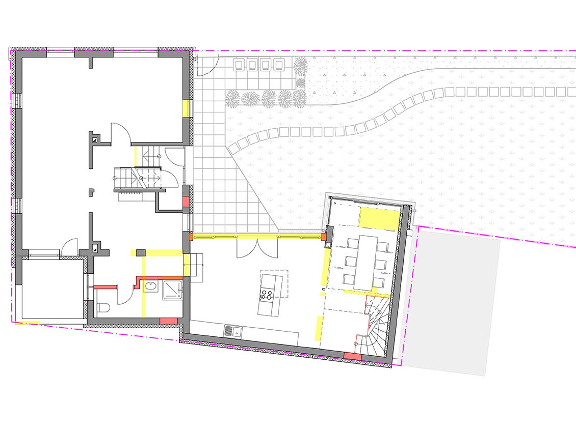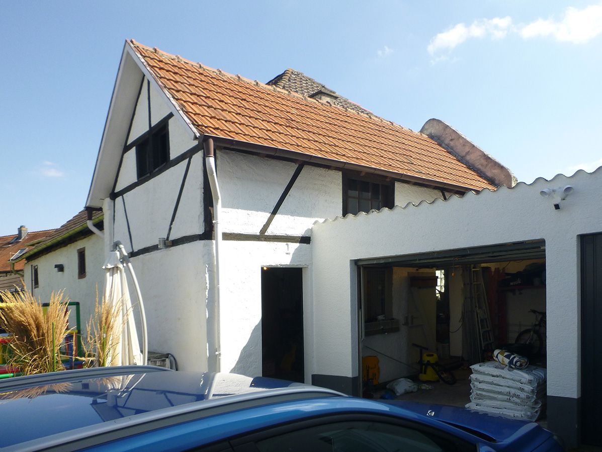 Das teilsanierte Gebäude aus den 30er-Jahren und ein Nebengebäude aus der Zeit um 1900, werden durch einen Zwischenbau verbunden. Die bestehende Garage auf der Fläche des Zwischenbaus wird dazu abgerissen. Das gesamte Ensemble wird energetisch saniert, die Raumkonzeption für das Einfamilienhaus wird durch den Umbau optimiert. Durch die energetische Sanierung entsteht ein KfW-70-Gebäude.