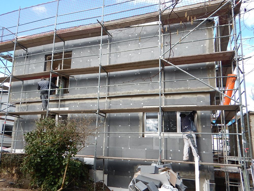 Im Zuge der Sanierung wurde die Gebäudehülle durch eine Außendämmung, durch neue Fenster und eine Aufdachdämmung ertüchtigt. Der Ölkessel aus der Erbauerzeit wurde durch einen Ölbrennwertkessel ersetzt, weil die unterirdische Öllagerungsanlage weiter benutzt werden konnte. Die vorher dezentrale Warmwasserversorgung läuft jetzt zentral über die Heizanlage. Das Ergebnis aller energetischen Maßnahmen ist ein KfW-100 Effizienzhaus.