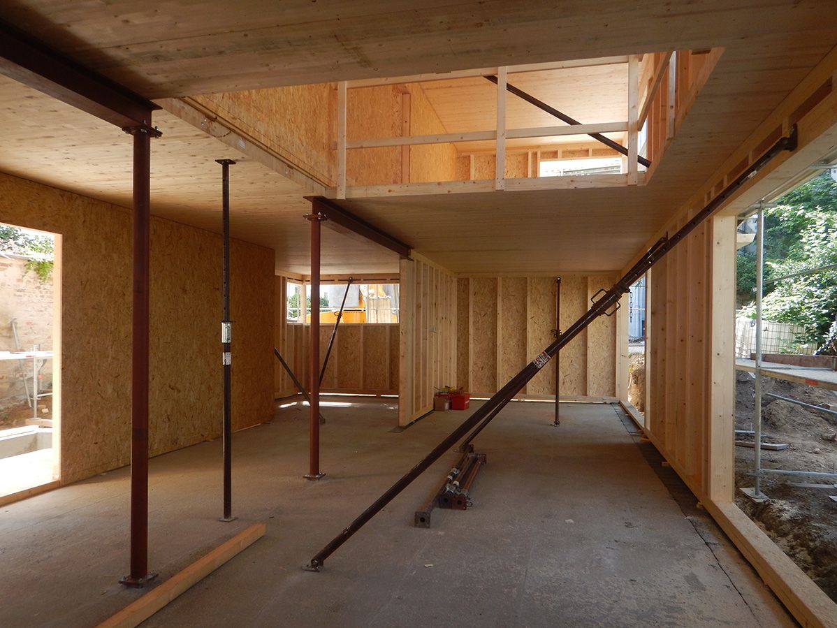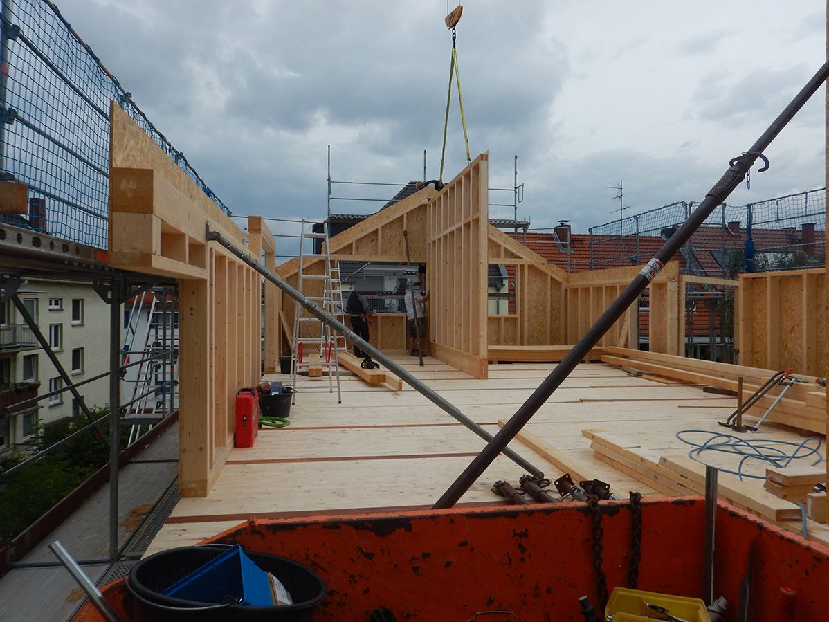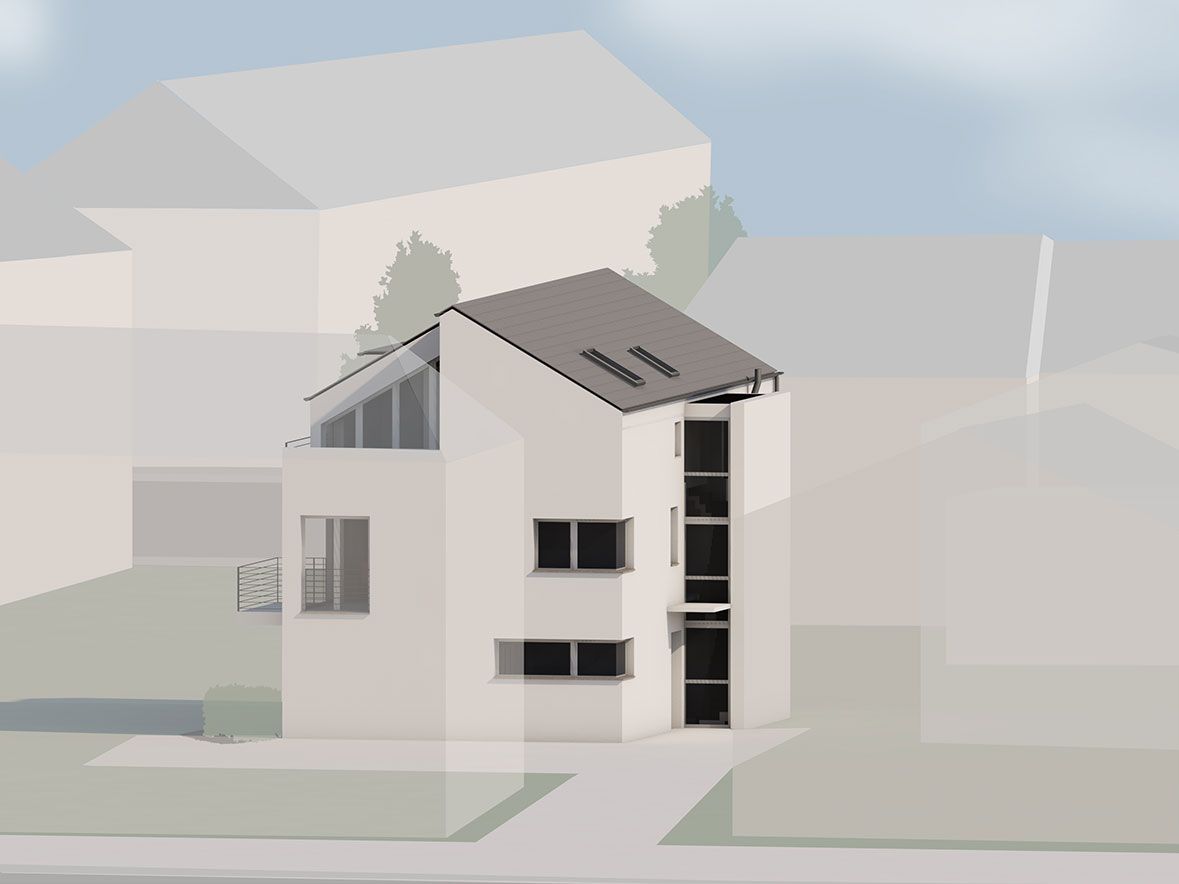 Das Dreifamilienhaus als Verdichtungsbau in einem Wohnviertel wird oberhalb des Kellers komplett in Holzbauweise errichtet. Das Gebäude hat einen ausgesprochen gutes Wohnklima und eine sehr gute Ökobilanz. Die drei verschieden großen Wohneinheiten sind jeweils individuell gestaltet. Das Gebäude fügt sich auf knappem Grundstück gut in die Umgebungsbebauung ein.